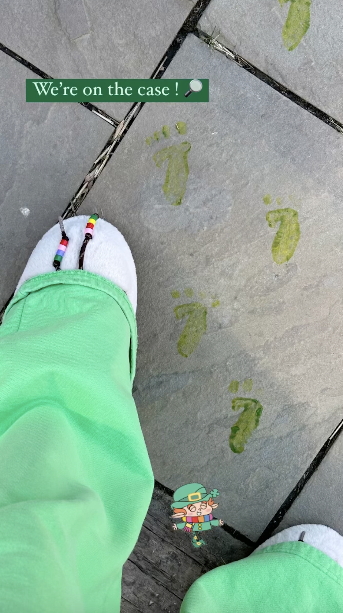 The model shared a snap seemingly of her daughter, Khai, following green footsteps. The three-year-old donned green pants and white fuzzy shoes. "We're on the case!" Hadid wrote, alongside the magnifying glass emoji.Courtesy of Gigi Hadid/Instagram